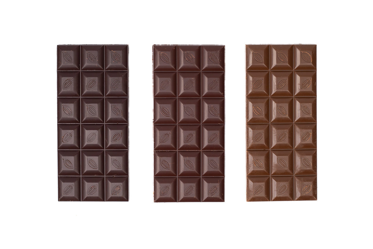 The percentage you see on your dark chocolate bar indicates the ratio of cacao to sugar and other ingredients in the bar. Higher percentage bars are more concentrated, allowing the natural chocolate flavors to come forward. The flavors you taste can vary by variety of beans used in the bar, post harvest care (fermentation), their origin, the terroir, the roast and the conche.